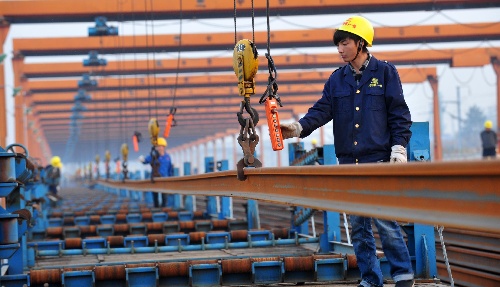 武漢,2010年11月26日 石武鐵路客運(yùn)專線湖北段即將開始鋪軌 11月26日,中鐵十一局集團(tuán)職工在吊運(yùn)鐵軌,為鋪軌做準(zhǔn)備。 經(jīng)過中鐵十一局集團(tuán)等單位建設(shè)者的艱苦奮戰(zhàn),石武鐵路客運(yùn)專線湖北段建設(shè)進(jìn)展順利,鋪軌工作已準(zhǔn)備就緒,將于12月上旬開始鋪軌。石武鐵路客運(yùn)專線建成后,石家莊到武漢的行車時間,將由目前的6至9個小時,縮短到3個多小時。