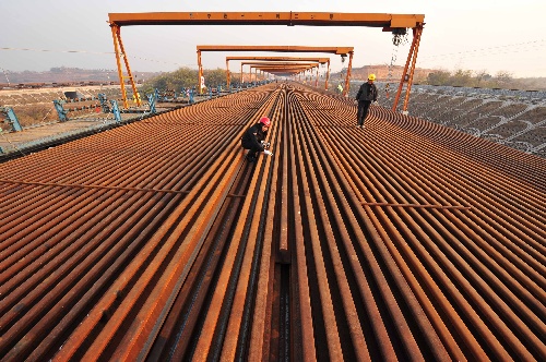 武漢,2010年11月26日 石武鐵路客運(yùn)專線湖北段即將開始鋪軌 11月26日,中鐵十一局集團(tuán)技術(shù)人員在查驗(yàn)500米長軌,為鋪軌做準(zhǔn)備。 經(jīng)過中鐵十一局集團(tuán)等單位建設(shè)者的艱苦奮戰(zhàn),石武鐵路客運(yùn)專線湖北段建設(shè)進(jìn)展順利,鋪軌工作已準(zhǔn)備就緒,將于12月上旬開始鋪軌。石武鐵路客運(yùn)專線建成后,石家莊到武漢的行車時間,將由目前的6至9個小時,縮短到3個多小時。